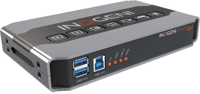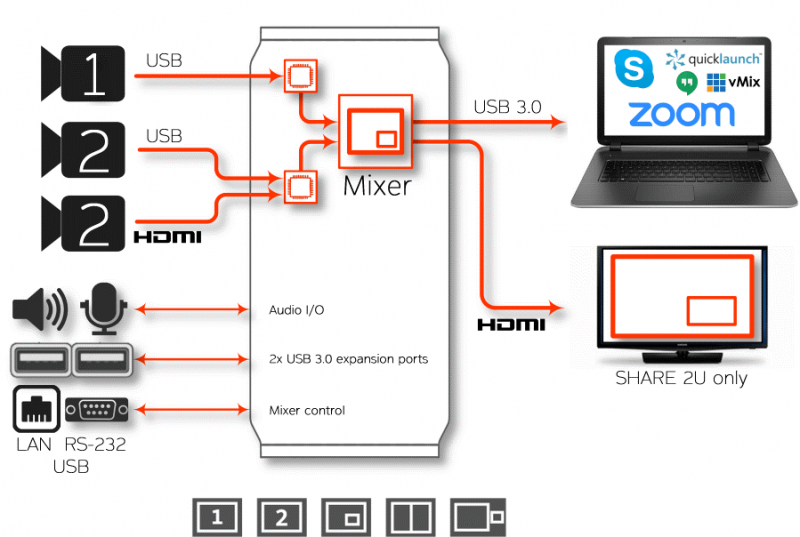 Enheten kan styras av en applikation på värdsidan med våra USB HID-, RS-232- eller LAN-gränssnitt. Du kan också använda knappsatsen ovanpå enheten för att styra den manuellt. Du kan använda Mixer-funktionen i SHARE 2U för att bädda in dina två videokällor i en enda ström. Denna funktion kan vara en viktig tillgång för dig om din applikation bara stöder ett videogränssnitt, som Teams®, Skype®, Zoom®, Webex®, GoToMeeting® och alla videokonferensapplikationer.