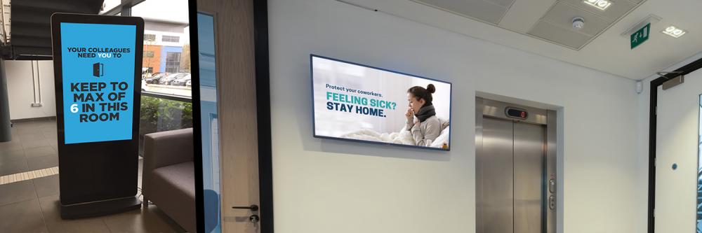 Med en signage-lösning (informationsskärm) når man snabbt och enkelt ut alla medarbetare. Genom att montera en informationsskärm i lunchrum, korridorer, entré, reception etc. kan man enkelt informera om läget, påminna om hygien, hänvisa till specifika rum/lokaler etc.