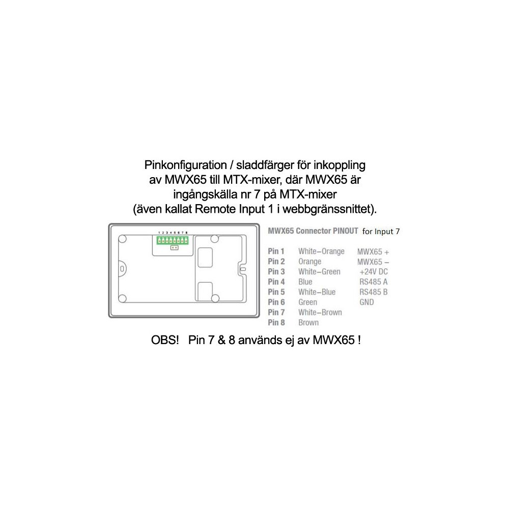CLIP-indikatorerna på fronten av MWX65 visar när nivån på motsvarande ingång är för hög och limitern på utgången från MWX65 (till MTX) börjar att dra ner hela den totala mixade utsignalen. Anslutning till mixern MTX48/88 görs med UTP CAT5e (eller bättre), upp till 300m med repeater. Euroblock plint-kontakt / väggpanel.
