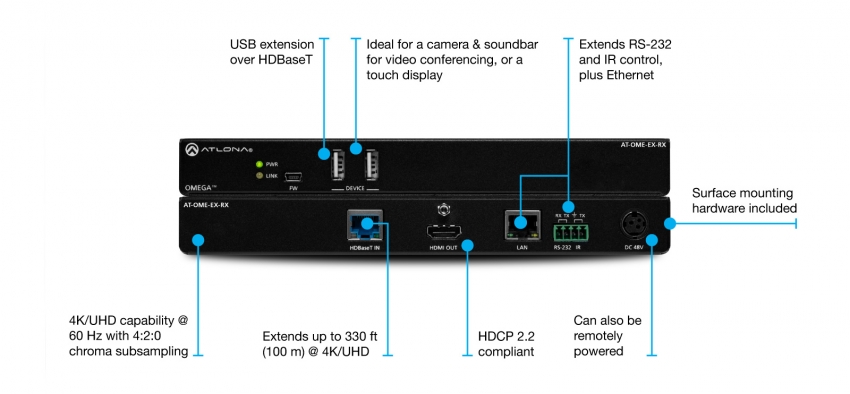 Atlona AT-OME-EX-RX är en HDBaseT-mottagare för video upp till 4K / 60 4: 2: 0, plus inbäddat ljud, kontroll, Ethernet och USB över avstånd upp till 100 meter. En del av Omega ™ -serien med integrationsprodukter för modern AV-kommunikation och samarbete, OME-EX-RX är HDCP 2.2-kompatibel och tar emot IR-, RS-232- och IP-styrsignaler. Med en matchande HDBaseT-sändare hanterar den integrerade USB-förlängningen utmaningen att ansluta mellan USB-enheter på avlägsna platser, och är idealisk för programvarukonferenser och pek eller interaktiva skärmar. OME-EX-RX innehåller två USB-gränssnitt för enheter som en kamera, soundbar eller skärm. Denna mottagare är idealisk för användning med sändare i Omega-serien såväl som växlare med HDBaseT-utgångar. OME-EX-KIT som inkluderar OME-EX-TX och OME-EX-RX finns också.