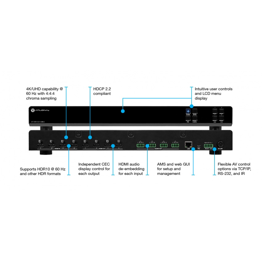 Atlona AT-HDR-H2H-44MA är en 4 × 4 HDMI-matrisomkopplare för HDR-format (High Dynamic Range). Den är HDCP 2.2-kompatibelt och stöder 4K / UHD-video @ 60 Hz med 4: 4: 4 samt HDMI-datahastigheter på upp till 18 Gbps. Den är kompatibel med alla videoupplösningar, ljudformat och färgutrymme som stöds i HDMI 2.0b-specifikationen, plus möjligheten att skicka metadata för HDR-innehåll. HDR-H2H-44MA inkluderar EDID- och HDCP-hanteringsfunktioner och kan skicka CEC-skärmkontroll oberoende till varje utgång. En obalanserad analog ljudutgång är ihopkopplad med varje HDMI-ingång för att skicka inbäddat HDMI-ljud till ett eget ljudsystem. HDR-H2H-44MA kan styras via Ethernet, RS-232 och IR. En handhållen IR-fjärrkontroll ingår.