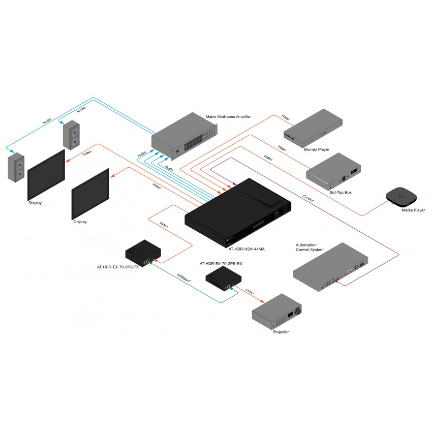 Obs! HDR-H2H-44MA inbäddar HDMI tvåkanaligt PCM-ljud. För extrahering och nedmixning av Dolby®- och DTS®-ljud rekommenderar Atlona att man lägger till en eller flera AT-HDR-M2C-ljudomvandlare.