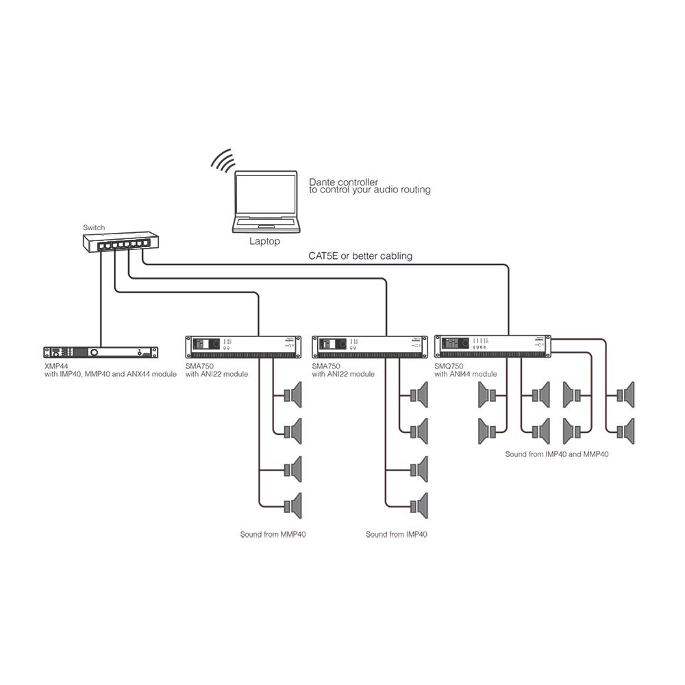 ANI44XT gör det även möjligt att skicka ljudsignaler vidare i Dante-nätverket, även om de ansluts till SMA/SMQ förstärkaren analogt.