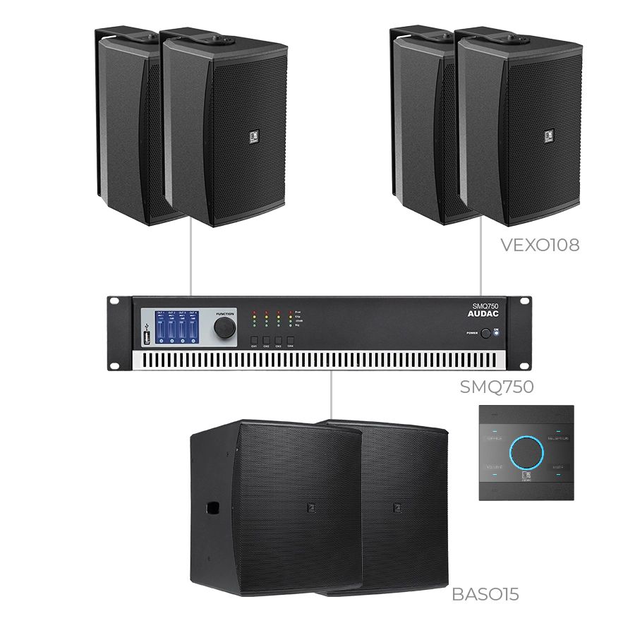 Audac Ljudpaket – Komplett kraftfullt ljudsystem (VEXO108/B + BASO15/B + SMQ750 + NCP105)