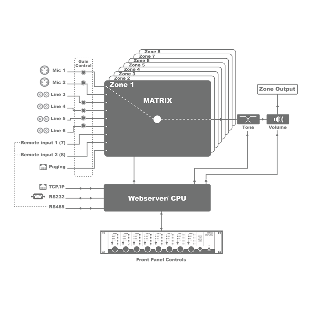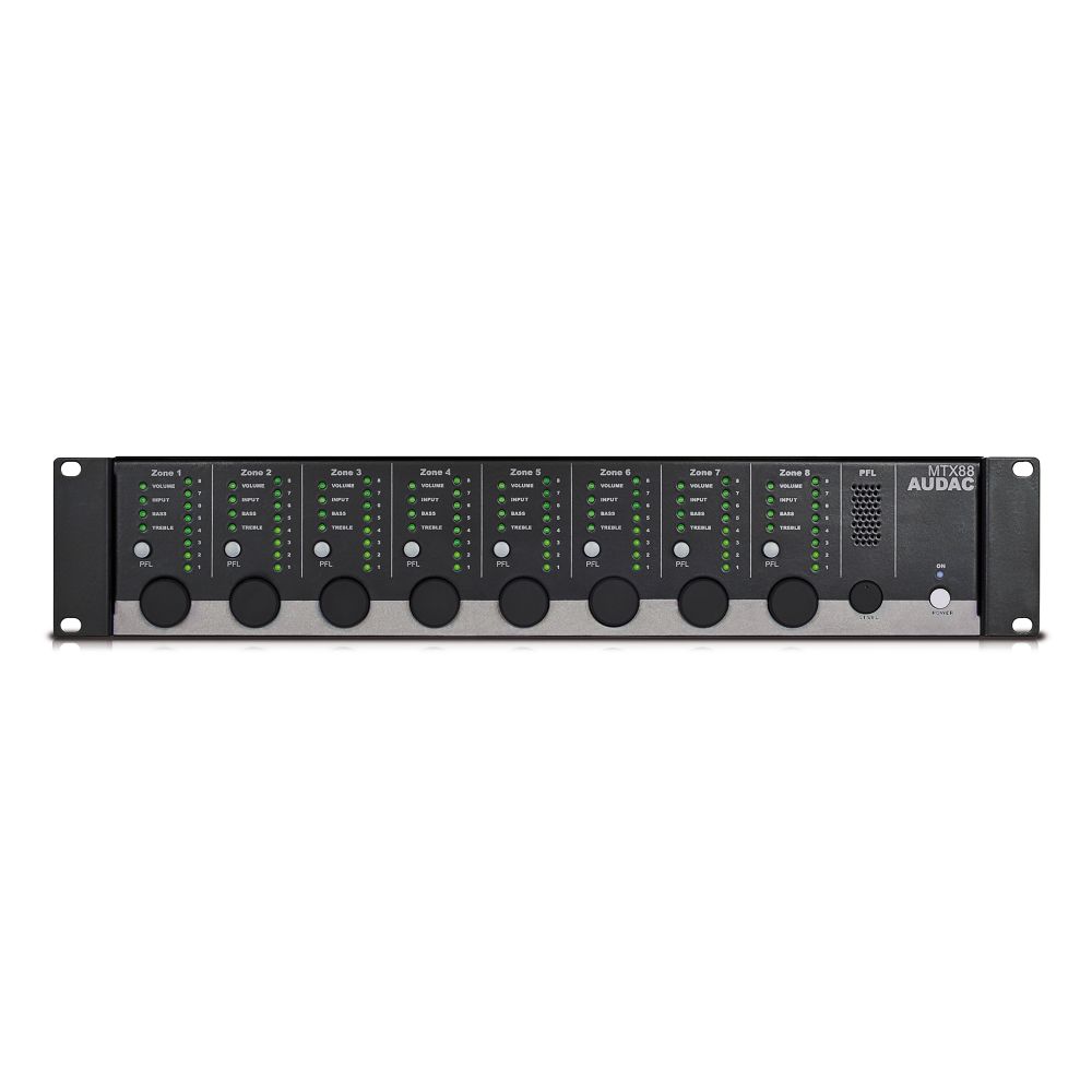 Audac MTX88 är en preamp/audio matrix med åtta oberoende utgångszoner. Varje zon har volymkontroll, två-bands EQ och möjlighet till valbar ingång.