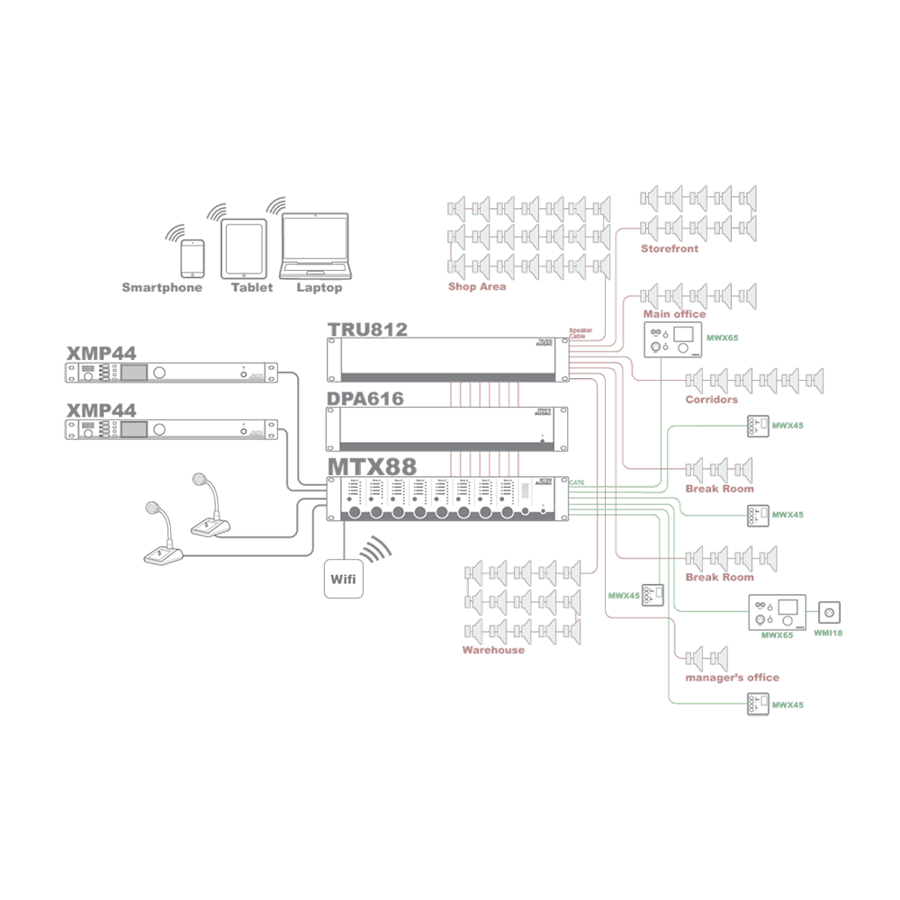 Dessutom kan väggpanelen MWX65 med två ljudingångar, line och mik, kopplas in, en till varje zon ut. Dock kan ljudsignalen som kopplas in via väggpanelen MWX65 endast fås ut på den zon där väggpanelen är inkopplad.