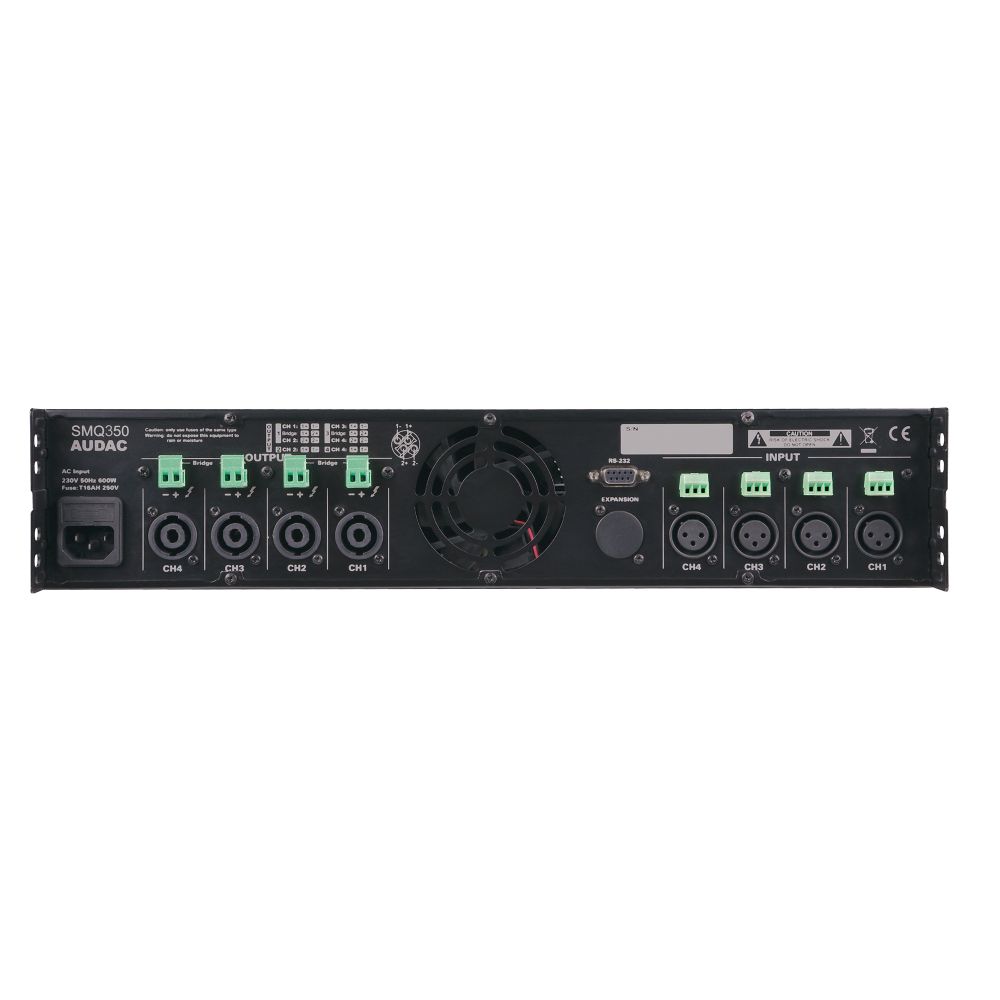 Audac SMQ350 är ett 4-kanals-steg för lågohm. Steget är försedd med en WaveDynamics™ DSP-processor, vilket ger bl.a. aktiv delning, 7-bands EQ, limiter, bass-boost, delay m.m. Plint / XLR in och alla utgångar har plintanslutning samt Speakon.