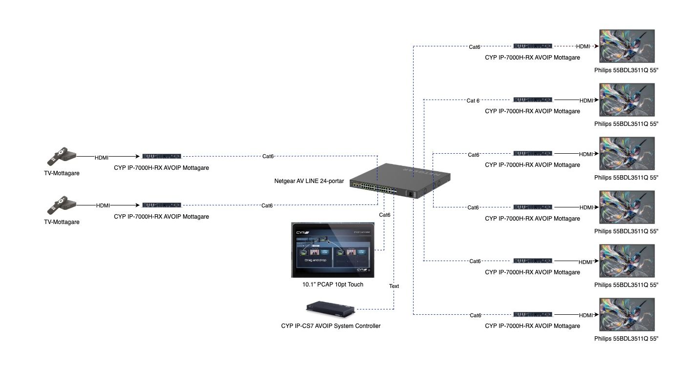 Önskar man fler antal skärmar är det enkelt att addera skärmar samt CYP IP-7000H-RX AVOIP Mottagare.