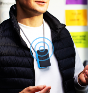 Bär runt halsenHäng den runt halsen och använd den inbyggda mikrofonen för att presentera utan sladdar. |