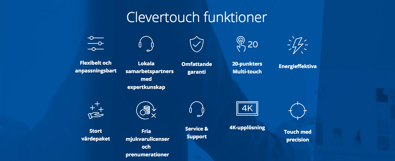 Clevertouch interaktiva touchskärmar kombinerar toppmodern teknik med användarvänlig design för att skapa inspirerande möten, lektioner och samarbeten. Med en responsiv multi-touch-yta, inbyggd Android-plattform och kraftfull ljud- och bildkvalitet blir Clevertouch det självklara valet för klassrum, konferensrum och kreativa arbetsmiljöer.