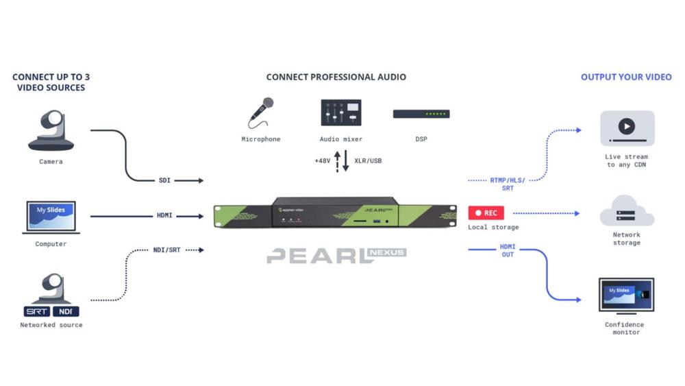 Med ett komplett utbud av videoingångar (SDI, HDMI, USB, SRT och NDI) och professionella ljudingångar (XLR, USB och 3,5 mm), blir Pearl Nexus den mest flexibla streamingenheten i branschen. Pearl Nexus har flera smarta inbyggda funktioner och kan spela in och streama upp till 3 kanaler samtidigt med 1080p-video. Pearl Nexus kommer med en inbyggd 1 TB SSD disk där du kan lagra alla dina inspelningar. Välj själv om enheten ska monteras som fristående enhet eller i rack med tillhörande rackvinklar.
