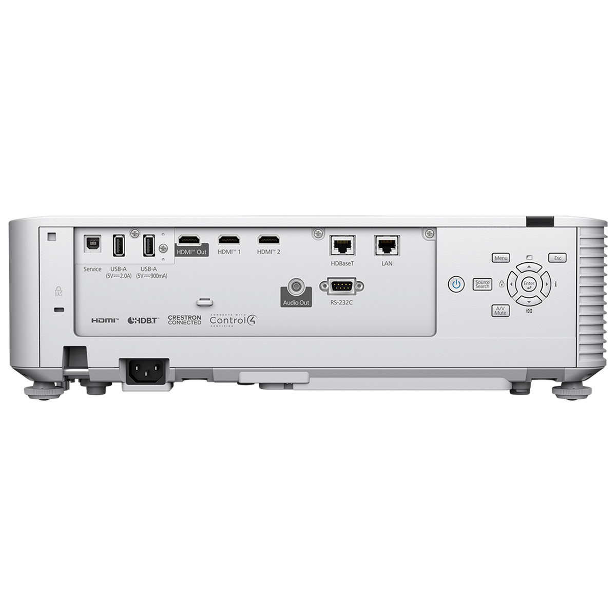 HDMI HDBaseT Ethernet USB-uppspelning Miracast Apple AirPlay 2 NFC-konfiguration Den stöder även fjärrövervakning via Epson Projector Management Cloud (EPMC) och integration med styrsystem som Crestron och Extron.