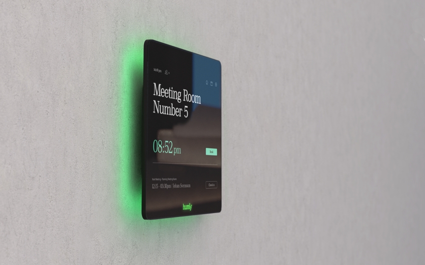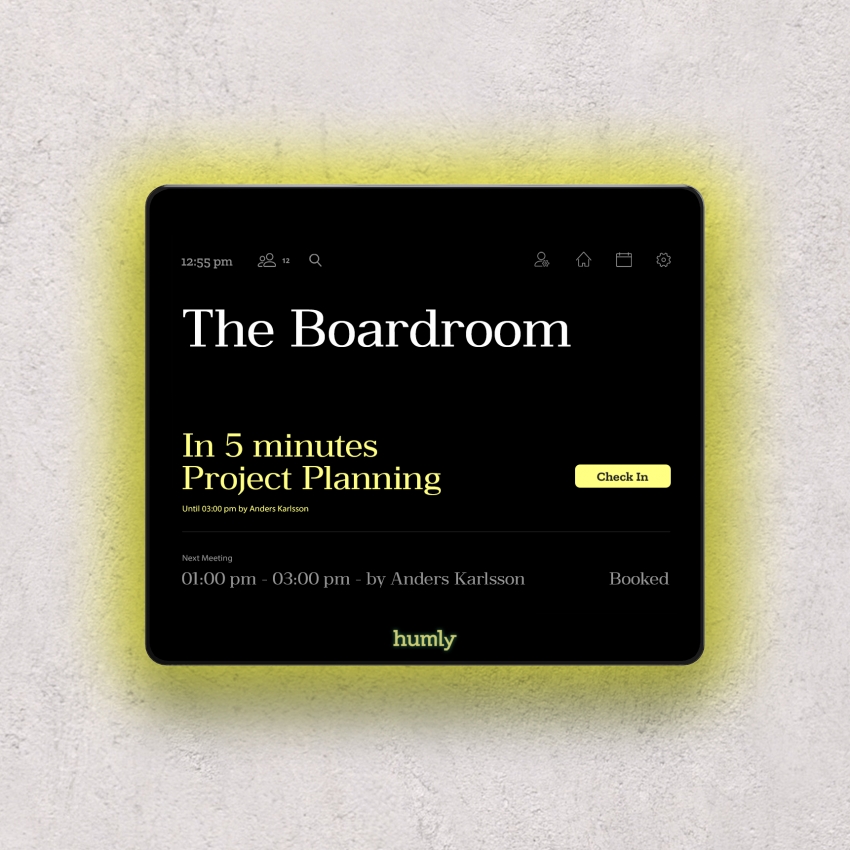 Med Humly Room-displayen behöver du inte längre störa ett pågående möte och du kommer omedelbart att ta bort mycket av friktionen relaterad till mötesrumsbokningar.
