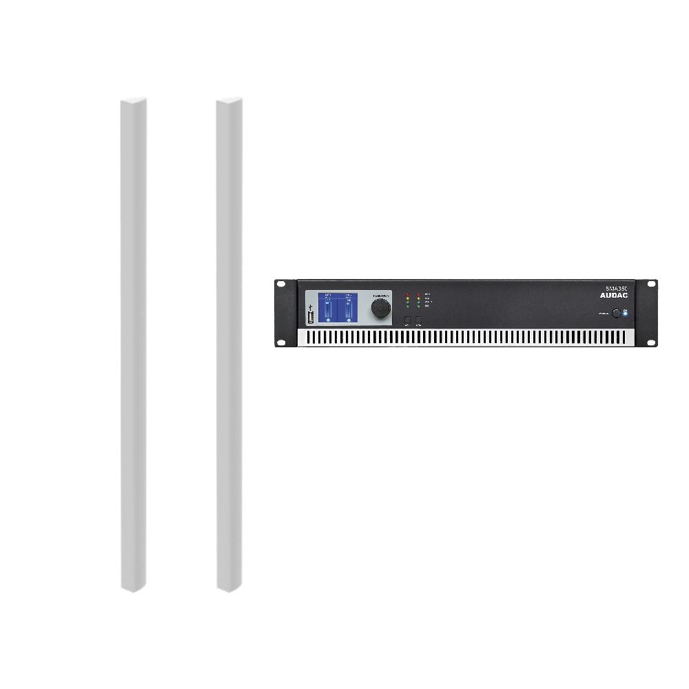 Upplev kristallklart och jämnt ljud med detta stilrena ljudpaket från Audac, bestående av två KYRA24 pelarhögtalare och en SMA350-förstärkare.