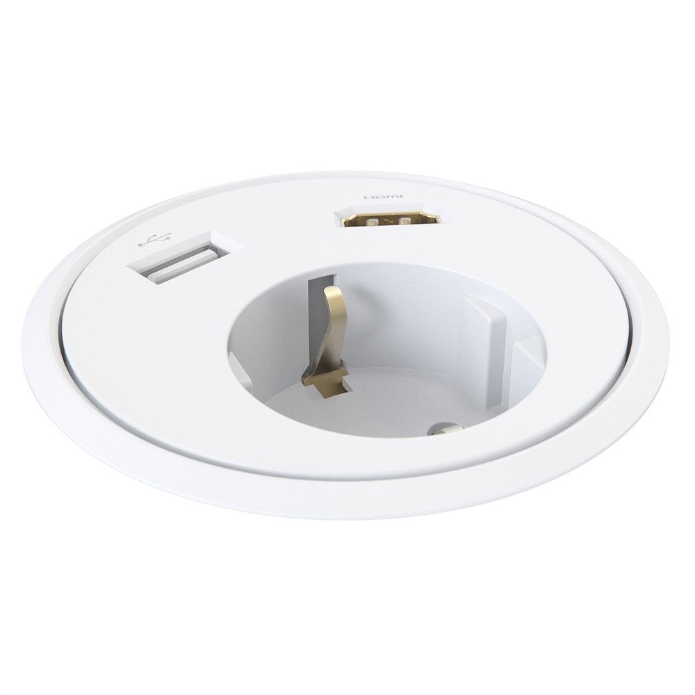 Powerdot 13 har ett eluttag, en HDMI-anslutning samt en USB/A-port (för inkoppling av t.ex. tangentbord/mus). Den monteras enkelt genom bordsskivan i ett 79 mm hål och skruvas smidigt och säkert på plats med en gängad ring under skivan, ingen elektriker behövs. Uttaget blir heller aldrig inaktuellt då det snabbt och enkelt går att byta ut till en ny Powerdot i samma hål, allteftersom tekniken uppdateras.