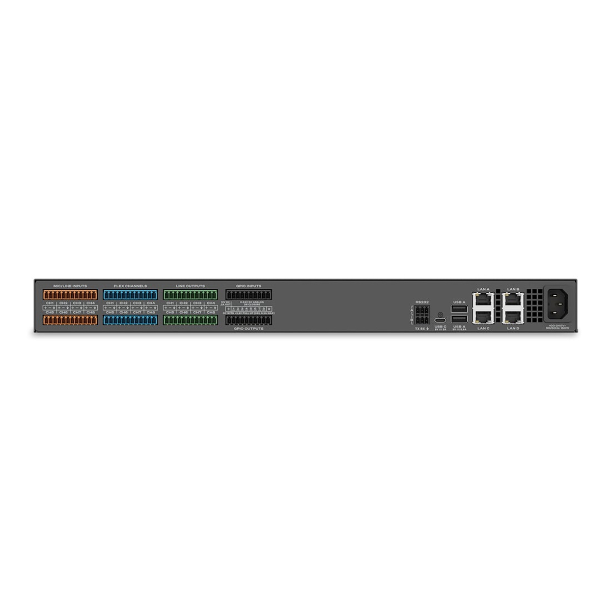 Core 24f erbjuder omfattande anslutningsmöjligheter med dubbla 2.5 Gbps nätverksportar, USB-C för AV bridging, GPIO och RS232 för styrintegration samt stöd för Dante (upp till 64 × 64). Detta gör den till en central hubb i komplexa system.