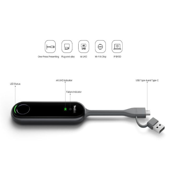 Yealink PA20 är din 4K Ultra HD, IP BYOD presentationsassistent. Med 4K/30FPS hårdvaruavkodning kräver den ingen programvara eller drivrutinsinstallation. Kompatibel med USB Type-A och Type-C, erbjuder PA20 snabb installation med sin inbyggda mötesassistent och Wi-Fi 6. Koppla bara in den och börja presentera utan ansträngning.